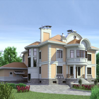 Краткая характеристика проекта: двухэтажный дом с мансардой 23x28 (23 на 28 м), общей площадью 917 кв.м, из кирпича, со вторым светом, с бассейном, с зимним садом, с террасой, с котельной.