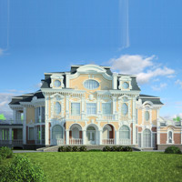 Краткая характеристика проекта: двухэтажный дом с цоколем и мансардой 27x35 (27 на 35 м), общей площадью 1247 кв.м, из кирпича, со вторым светом, с бассейном.