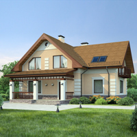 Краткая характеристика проекта: дом с мансардой 14x13 (14 на 13 м), общей площадью 191 кв.м, из газобетона (пеноблоков), с кухней-столовой.