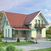 Краткая характеристика проекта: дом с мансардой 9x10 (9 на 10 м), общей площадью 123 кв.м, из газобетона (пеноблоков), с террасой, с котельной, с кухней-столовой.