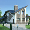 Краткая характеристика проекта: дом с мансардой 16x15 (16 на 15 м), общей площадью 218 кв.м, из газобетона (пеноблоков), со вторым светом, с террасой, с котельной, с кухней-столовой.