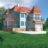 Краткая характеристика проекта: двухэтажный дом с цоколем 13x13 (13 на 13 м), общей площадью 294 кв.м, из кирпича, с гаражом, с террасой, с котельной, с кухней-столовой.