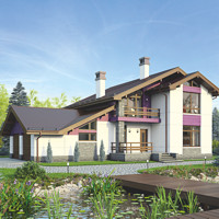 Краткая характеристика проекта: дом с мансардой 18x15 (18 на 15 м), общей площадью 215 кв.м, из газобетона (пеноблоков), с гаражом, с террасой, с котельной.