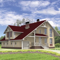 Характер фасадов дома формируется двумя мощными шестигранными эркерами. На первом этаже перегородками выделен входной блок, включающий в себя: прихожую, лестницу, техническое помещение. Гостиная, столовая и кухня представляют собой перетекающее, открытое пространство, позволяющее создать эффектные интерьеры. Гараж на две машины запроектирован тёплым (+5С). Из него имеется вход непосредственно в жилой дом. При желании на месте для второй машины может быть устроена сауна с выходом на участок или в пристроенную веранду.