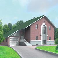 Дом задуман как очень компактный и экономичный объем, наделенный однако высоким уровнем комфорта и хорошо прорисованной архитектурой. Характер фасадов дома формируется большим эркером в гостиной, выступающей частью кухни и аркой окна в лестничной клетке. Большая гостиная является архитектурным ядром дома. Эта комната предназначена для коммуникации членов семьи и для приема гостей. Второй этаж дома - тихая зона отдыха: там расположены 3 спальни и большая ванная комната.