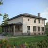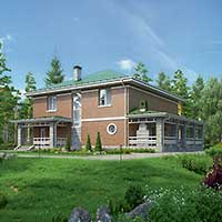 Краткая характеристика проекта: двухэтажный дом 16x16 (16 на 16 м), общей площадью 289 кв.м, из газобетона (пеноблоков), с террасой, с кухней-столовой.