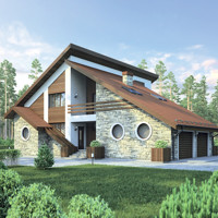 Краткая характеристика проекта: дом с мансардой 16x17 (16 на 17 м), общей площадью 255 кв.м, из кирпича, с гаражом, с террасой, с котельной.