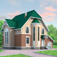 Краткая характеристика проекта: двухэтажный дом с мансардой 10x14 (10 на 14 м), общей площадью 243 кв.м, из газобетона (пеноблоков), с гаражом, со вторым светом, с кухней-столовой.