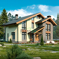 Краткая характеристика проекта: дом с мансардой 16x14 (16 на 14 м), общей площадью 242 кв.м, из кирпича, с террасой, с котельной.