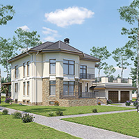 Краткая характеристика проекта: двухэтажный дом с цоколем 20x15 (20 на 15 м), общей площадью 439 кв.м, из кирпича, с гаражом, с террасой, с котельной, с кухней-столовой.