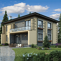 Краткая характеристика проекта: двухэтажный дом 13x13 (13 на 13 м), общей площадью 188 кв.м, из газобетона (пеноблоков), с террасой, с котельной, с кухней-столовой.