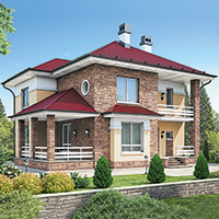 Краткая характеристика проекта: двухэтажный дом 12x12 (12 на 12 м), общей площадью 174 кв.м, из газобетона (пеноблоков), с террасой, с котельной, с кухней-столовой.