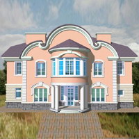 Семикомнатный загородный жилой дом имеет композиционные и стилистические черты русского ампира. Уровни здания смещены на пол-этажа вдоль продольной оси, что обеспечивает удобную связь между помещениями соседних этажей и создает пространственно богатый интерьер. Подобная структура дома дает возможность даже при небольшом падении рельефа комфортно использовать цокольный этаж. В цокольной части дома расположены сауна с бассейном и просторной комнатой отдыха, прачечная, котельная, погреб и прочие помещения. Из вестибюля центральный марш трехмаршевой лестницы ведет в двухсветную гостиную, находящуюся на пол-этажа выше. Гостиная связана арочным проемом со столовой и кухней. Последняя - с небольшим хозяйственным помещением с входом с улицы, к которому может быть пристроен гараж.