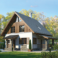 Краткая характеристика проекта: дом с мансардой 8x8 (8 на 8 м), общей площадью 121 кв.м, каркасного, с террасой, с котельной, с кухней-столовой.