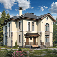 Краткая характеристика проекта: двухэтажный дом 14x12 (14 на 12 м), общей площадью 179 кв.м, из кирпича, с террасой, с котельной, с кухней-столовой.