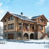 Краткая характеристика проекта: дом с мансардой и цокольным этажом 15x15 (15 на 15 м), общей площадью 409 кв.м, из дерева, с гаражом, с террасой, с котельной, с кухней-столовой.