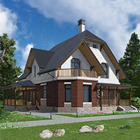 Краткая характеристика проекта: дом с мансардой 10x12 (10 на 12 м), общей площадью 156 кв.м, из кирпича, с террасой, с котельной, с кухней-столовой.