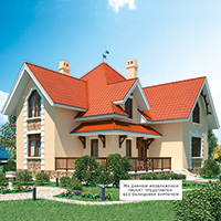 Краткая характеристика проекта: дом с мансардой 14x14 (14 на 14 м), общей площадью 221 кв.м, из газобетона (пеноблоков), с террасой, с котельной, с кухней-столовой.