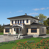 Краткая характеристика проекта: двухэтажный дом 15x15 (15 на 15 м), общей площадью 217 кв.м, из кирпича, с бассейном, с террасой, с котельной, с кухней-столовой.