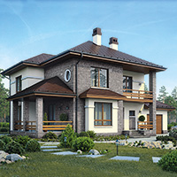 Краткая характеристика проекта: двухэтажный дом 21x12 (21 на 12 м), общей площадью 209 кв.м, из кирпича, с гаражом, с террасой, с котельной, с кухней-столовой.