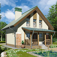 Краткая характеристика проекта: дом с мансардой 7x9 (7 на 9 м), общей площадью 77 кв.м, каркасного, с террасой, с котельной, с кухней-столовой.