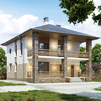 Краткая характеристика проекта: двухэтажный дом 10x13 (10 на 13 м), общей площадью 142 кв.м, из газобетона (пеноблоков), с террасой, с котельной, с кухней-столовой.