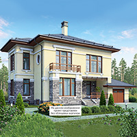 Краткая характеристика проекта: двухэтажный дом с цоколем 16x17 (16 на 17 м), общей площадью 342 кв.м, из кирпича, с гаражом, с террасой, с котельной, с кухней-столовой.