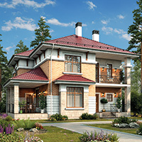 Краткая характеристика проекта: двухэтажный дом 14x12 (14 на 12 м), общей площадью 199 кв.м, из кирпича, с террасой, с котельной, с кухней-столовой.