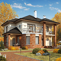 Краткая характеристика проекта: двухэтажный дом 12x12 (12 на 12 м), общей площадью 172 кв.м, из кирпича, с террасой, с котельной, с кухней-столовой.