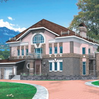 Краткая характеристика проекта: двухэтажный дом с мансардой 18x16 (18 на 16 м), общей площадью 586 кв.м, из газобетона (пеноблоков), с гаражом, с зимним садом, с террасой, с котельной, с кухней-столовой.