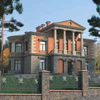 Краткая характеристика проекта: двухэтажный дом с цоколем и мансардой 18x21 (18 на 21 м), общей площадью 555 кв.м, из кирпича.