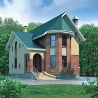 Дом двухэтажный с мансардной кровлей. Украшением коттеджа являются шестигранные эркеры по главному и боковому фасаду. Дом представляет собой компактный объем с прекрасным функциональным зонированием в плане. Есть вариант дома с пристроенным гаражом.
