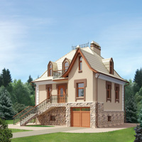 Краткая характеристика проекта: дом с мансардой и цокольным этажом 8x7 (8 на 7 м), общей площадью 126 кв.м, из газобетона (пеноблоков), с котельной, с кухней-столовой.